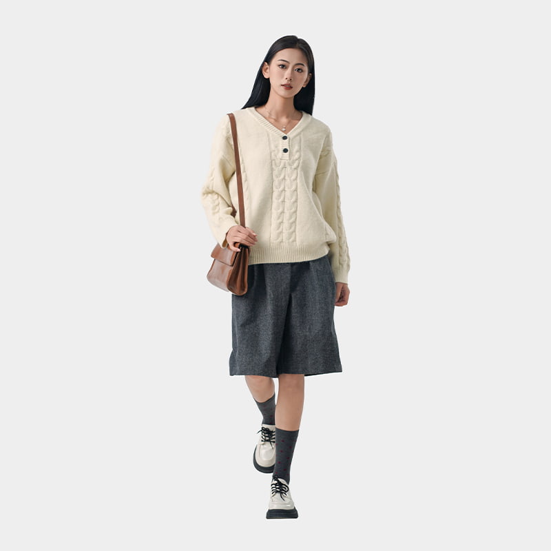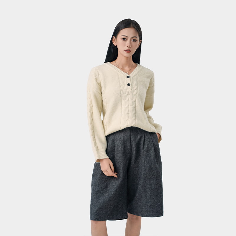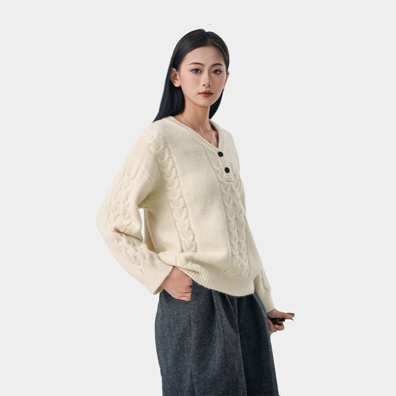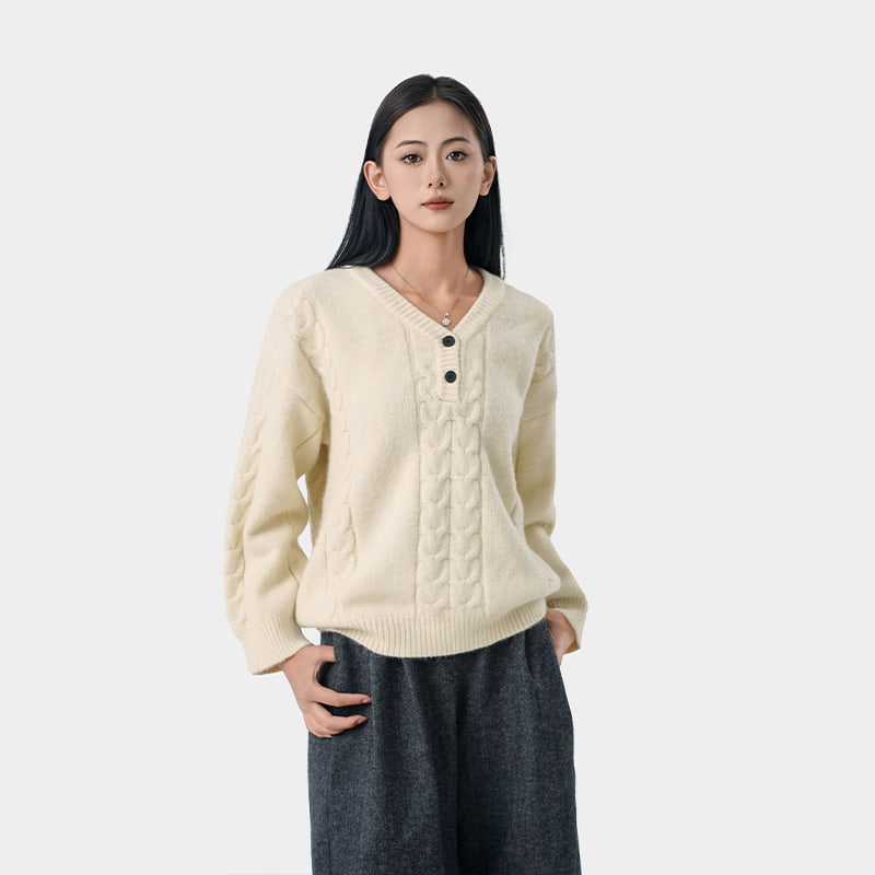 Un suéter informal y elegante. El cuello en V con el diseño del botón está adelgazando y agrega un toque de detalle. El ajuste suelto y relajado ofrece una experiencia de uso cómodo.