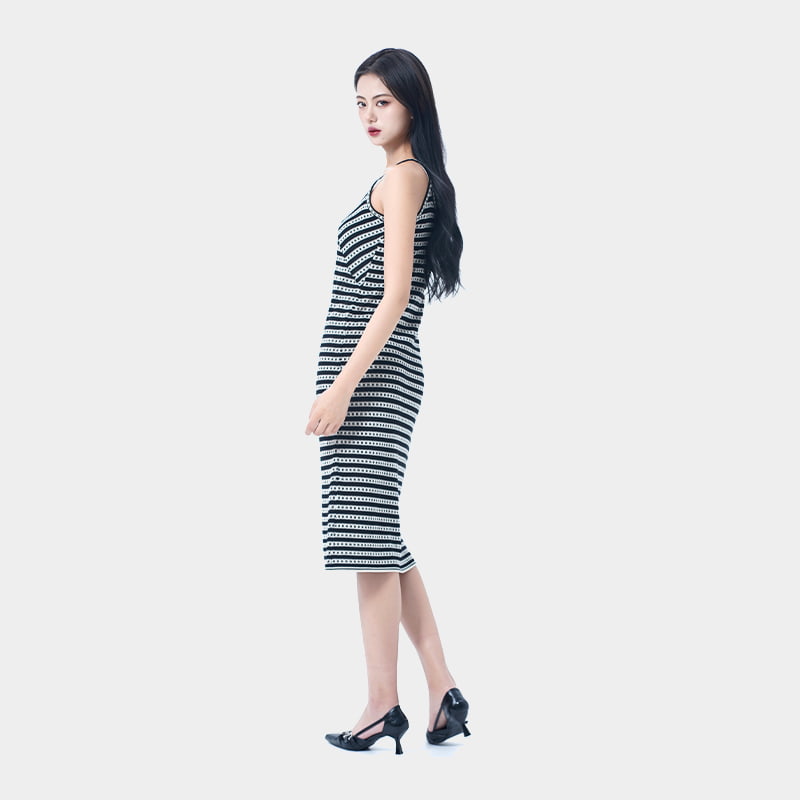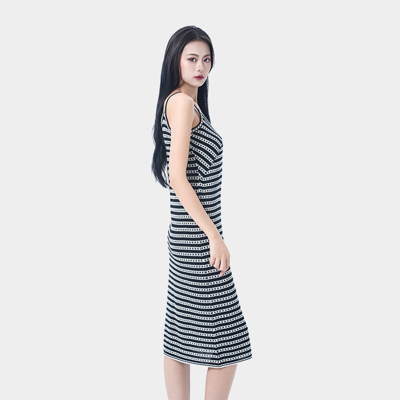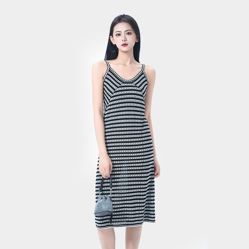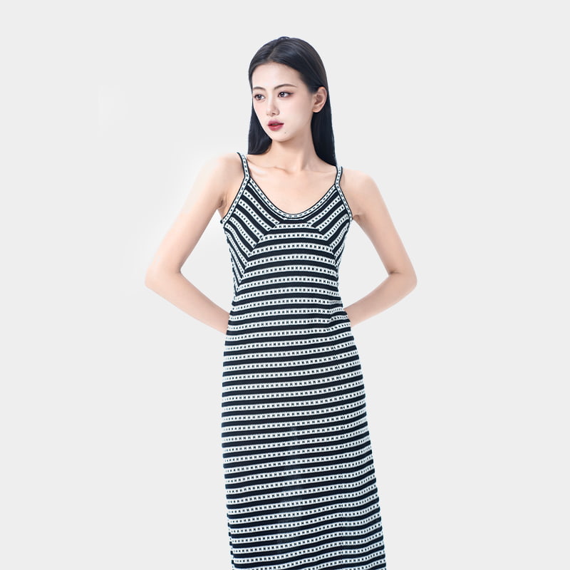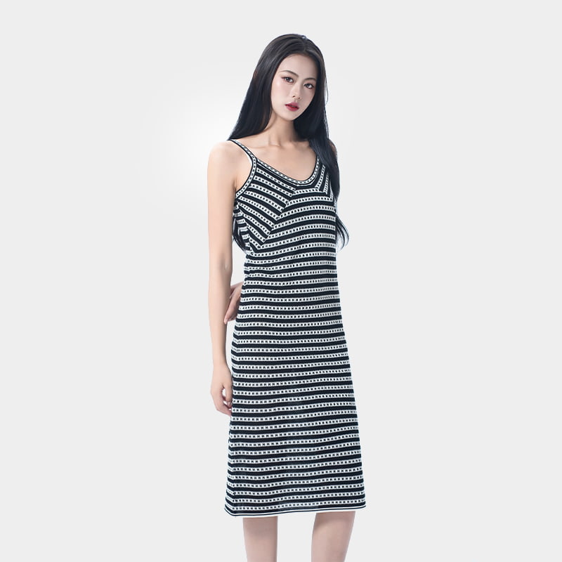 Las clásicas rayas en blanco y negro crean un efecto adelgazante al tiempo que alargan las proporciones del cuerpo. El diseño de la camisola destaca la clavícula y los hombros, dando una silueta elegante que halagará diferentes tipos de cuerpo. Hecho de hilo Lyocell exclusivo de verano, ofrece un toque fresco y sedoso que es transpirable y cómodo. Versátil en estilo, este vestido permite múltiples looks de verano con facilidad.